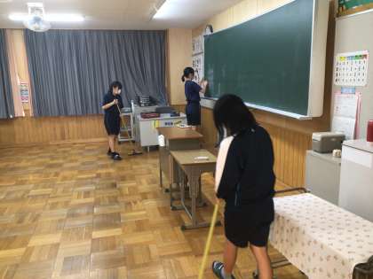 今日は、女子生徒が担当しています。本校では、自転車通学者の割合が高いため、一斉に下校すると道路が混み合い危険なため、時差を設けて下校を実施しています。そのため、男子生徒と女子生徒が交互に下校時刻を入れ替えています。少し分かりにくいとは思いますが、ご理解ください。