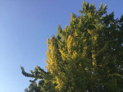 本校北側の駐輪場横に大きなイチョウの木があります。先週までは、緑色一色だった葉の色が、少しずつ黄色く色づき始めました。秋が深まりつつあるようです。