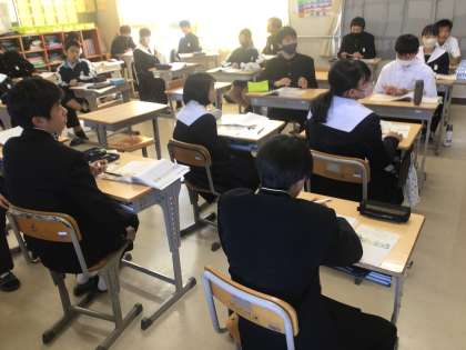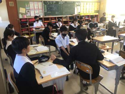 2年生の道徳科の授業では、学習用タブレットを活用したり、互いの表情を見ながら意見を聞き合うことができるように、生徒の机の配置を工夫するなどしています。