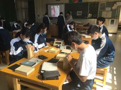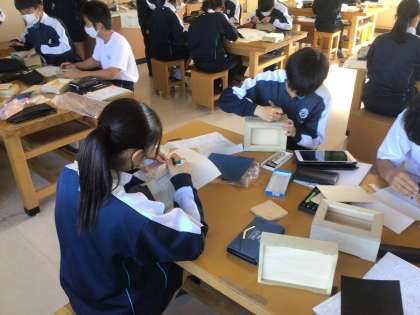 3年生の美術科の授業の様子です。木箱のデザインに取り組んでいます。卒業制作となります。生徒がそれぞれデザインしたものを作ります。手先の器用さが必要な作業を進めていました。