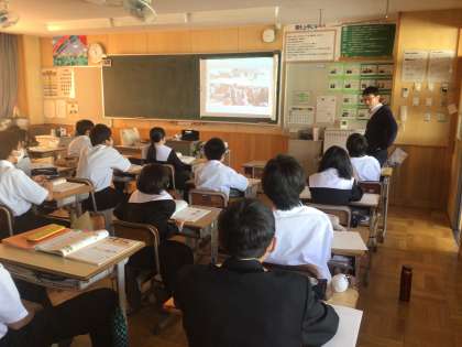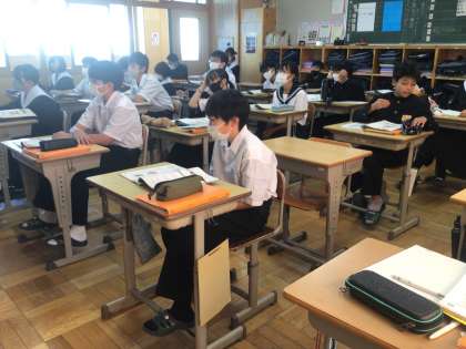 1年生の英語科の授業の様子です。授業のはじめに日本の伝統芸能、芸術で活躍する外国人の芸術家について紹介された動画を見て、授業を進めていました。