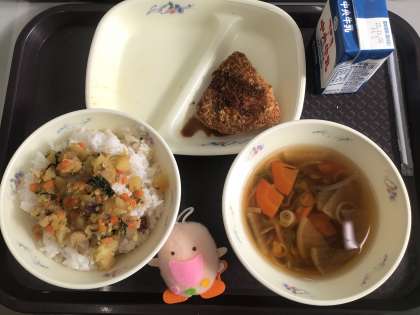 今日の給食の献立は「たべまるのおすすめ献立」でした。もみじごはんです。秋の紅葉の様子を、にんじん、さつまいも、みつばで表しています。このもみじごはんのレシピは、クックパッドで紹介されています。「たべまる給食」で検索してみてください。