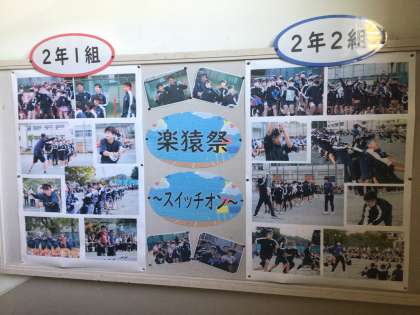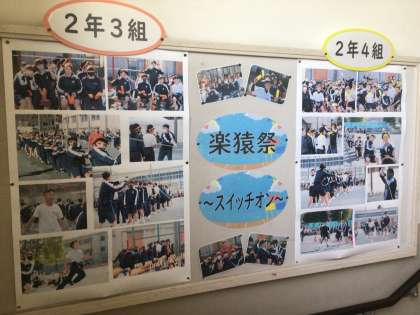 2年生の掲示板です。楽猿祭関連の掲示がされています。来週金曜日の学校公開日にご覧ください。
