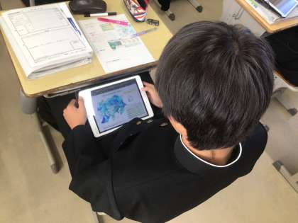 2年生の社会科の授業の様子です。関東地方の農業について学習していました。各都道府県の主たる農作物を学習用タブレットを活用して調べていました。