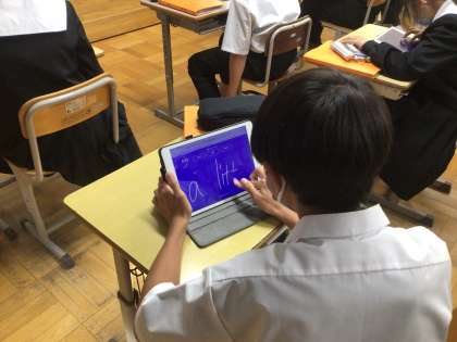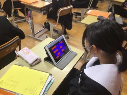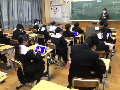 1年生の英語科の授業の様子です。学習用タブレットを活用して、よく使う表現方法について問題を解いていました。