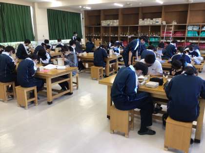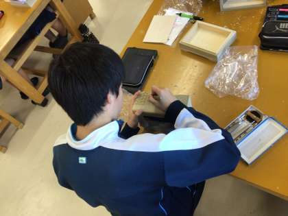 3年生の美術科の授業の様子です。木箱のふたの彫刻が進んできました。細かな作業が続きますが、根気強く取り組んでいます。
