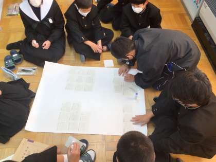 1年生は服のチカラプロジェクトのまとめをしています。グループで感想や工夫したこと、活動を通して学んだことなどをまとめていました。