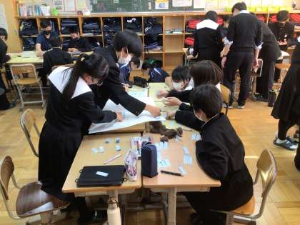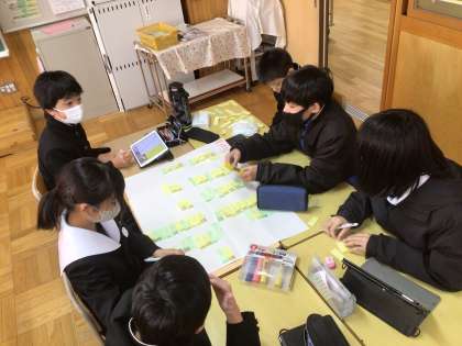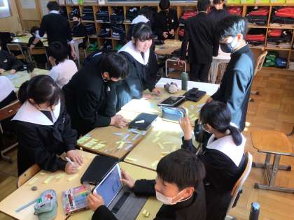 1年生のキャリア教育の様子です。身の回りにどんな仕事があるのかを調べて、グルーピングをしています。