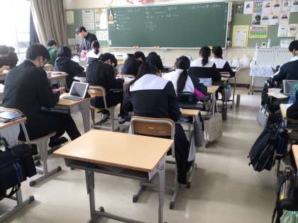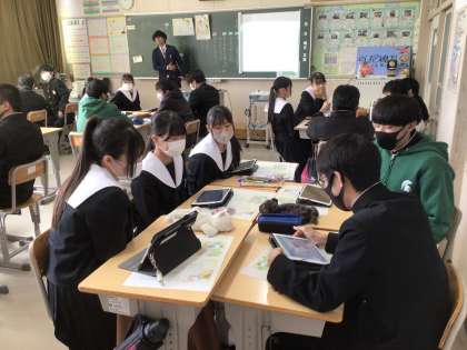 3年生の道徳科の授業の様子です。家族の在り方について「一冊のノート」という教材を使って考えていました。高齢の祖母が、物忘れが激しくなることで、迷惑だと考えていた主人公が、あることをきっかけにして、考え方や祖母に対する思いが変化するという内容です。生徒は、自身の思いをもとに、じっくりと考えているようでした。