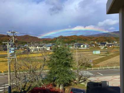 午前11時頃の本校から猿投山方向を見たら、虹がかかっていました。