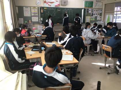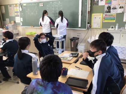 3年生の数学科の授業の様子です。図形の相似の性質を応用して、木の高さを求める活動をしていました。