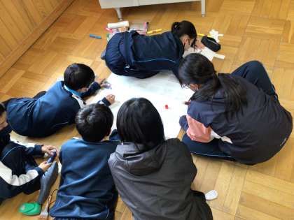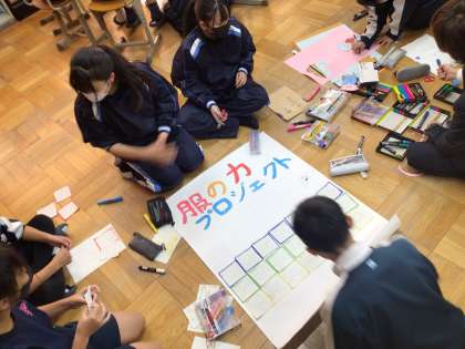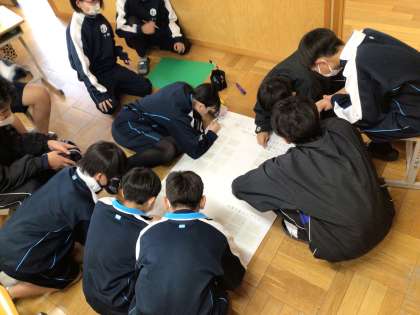 1年生の総合的な学習の時間の様子です。まとめづくりに取り組んでいます。班ごとに工夫しながら取り組んでいました。