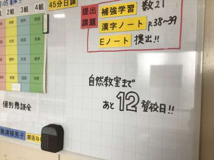 2年生の廊下にある連絡掲示板です。自然教室までの登校日が書かれています。1月11日(木)から2泊3日の予定です。今、生徒たちは、クラスや係の準備を進めています。来月の行事ですが、登校日を数えると、もうすぐですね。保護者の皆さまには、お忙しい中、書類やアンケートの提出にご協力いただきました。ありがとうございました。