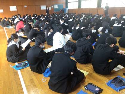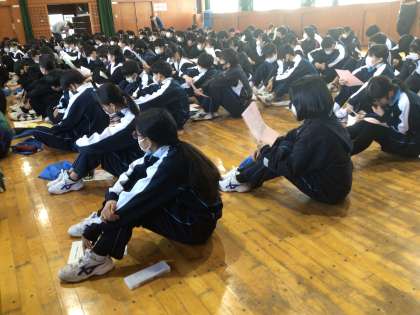 3年生は学年集会を実施しました。明日から「私立高校などのweb出願」の登録が始まりますので、その確認の内容が話されていました。保護者の皆さまには、お手数をおかけしますが、ご協力よろしくお願いします。