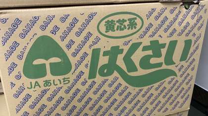 今日の給食の献立は「豊田ブランドの日献立」でした。豊田の食べ物をたくさん使った献立でした。ごはん「ミネアサヒ(年1回の登場)」、にんじん、キャベツ、大豆、豚肉「とよたひまわりポーク」はくさいです。今日のはくさいは、猿投地区でとれたものです。はくさいの入っていた箱にも「猿投」と書いてあります。わかりますか?