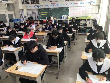 3年生は「学習診断テスト」でした。1時間目の国語科のテストから、数学科、社会科、理科のテストを実施し、給食後に英語科のテストを実施しました。英語科のテストの様子です。