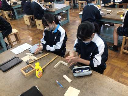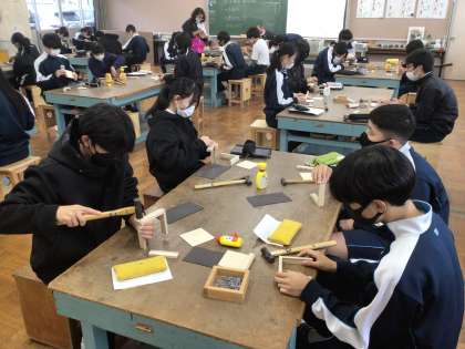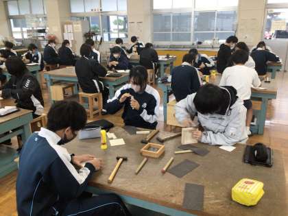 3年生の技術科の授業の様子です。木材を使ってものづくりをしていました。細かい作業ですが、集中して取り組んでいました。
