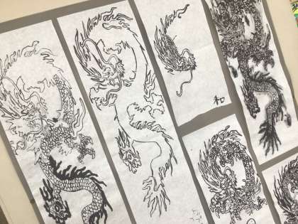 2年生の教室です。墨で描かれた「竜」が飾られていました。今年の干支「辰」を表現したようです。明日から2年生は「自然教室」です。