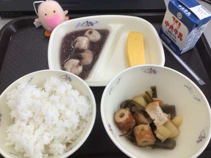 鏡開きは、毎年1月11日にお供えした鏡餅をさげ、無病息災を願って食べるというものです。今日の給食は、鏡餅のかわりに目玉もちを使ったぜんざいです。どうでしたか。