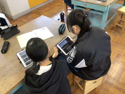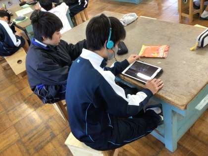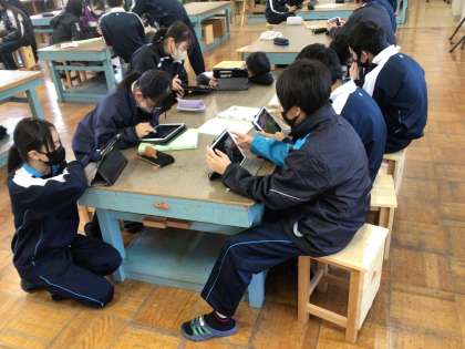 2年生の技術科の授業の様子です。猿投山美化登山をテーマにした動画づくりに取り組んでいます。お互いに教え合いながら、作品づくりを進めています。