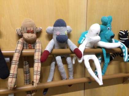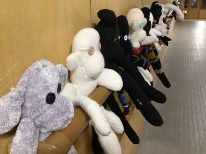 南館への渡り廊下がにぎやかになりました。家庭科で取り組んだ3年生の作品が飾られました。いろんな表情の作品が並んでいます。じっと見ていたら、今にも話しかけてくる感じでした。