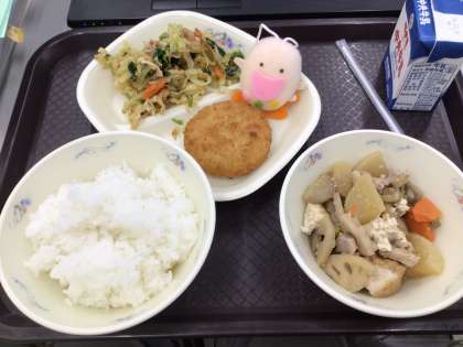 今日の給食は、「豊田ブランドの日」献立です。「豊田ブランドの日」献立では、たくさんの豊田市産の食べ物を使っています。生揚げ、油揚げ、ほうれん草、コロッケの中のとよたひまわりポーク、米(ミネアサヒの特別栽培米「赤とんぼ米」)が使われています。赤とんぼ米は、給食に初登場です。
