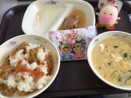 今日の給食の献立は「ひなまつり献立」です。ひなまつりにちなんだ、ちらしずしとひなあられが登場しました。ひなあられは、関東地方と関西地方では形が異なるようです。