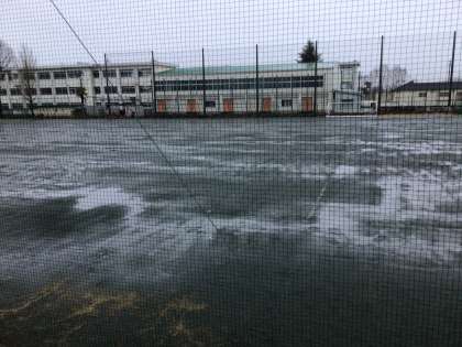 今朝は小雨が降っています。予報によると、今後雨はやむそうです。現在の運動場の様子です。
