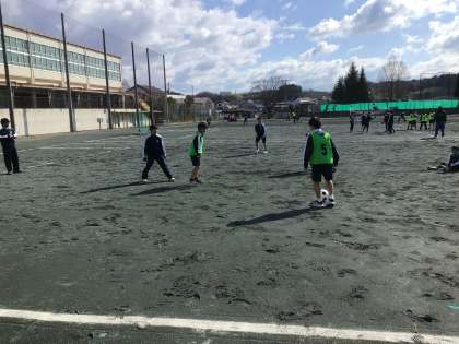 1年生の保健体育科の授業の様子です。サッカーをしています。昨日は雨が降り肌寒い日でしたが、今日は日差したっぷり、運動場で活動していると少し汗ばむ様子です。