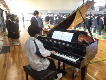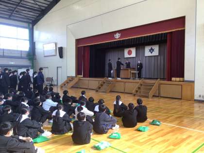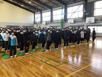修了式が行われました。各学年代表者に修了証が渡されました。その後、校長先生は仲間とともに協力することの大切さや仲間意識を深めることの大切さについて話されました。また、「夢は大きく根は深く」について、夢をかなえるためには、しっかりとした準備(根)が必要だと話され、猿投中学校でしっかりと根を太くしてほしいと話されました。式の最後には、校歌を歌いました。
