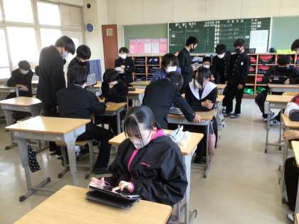 2年生の学級活動の様子です。掲示物づくりを進めていました。学習用タブレットを活用してデザインやレイアウトを相談していました。