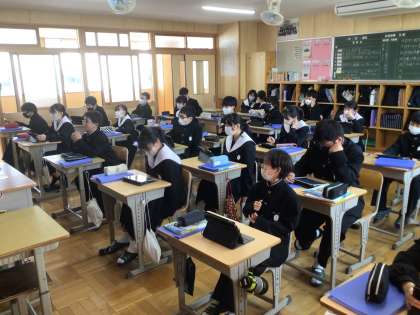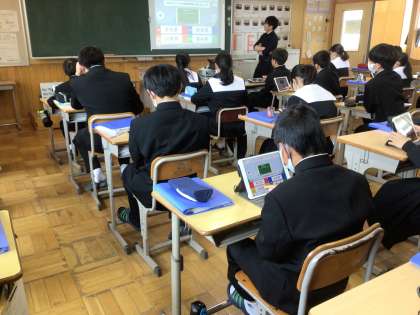 1年生の社会科の授業の様子です。学習用タブレットを活用して、都道府県の復習をしていました。クイズ形式にして、楽しみながら学んでいました。
