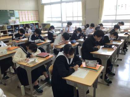 3年生の英語科の授業の様子です。授業のはじめに、まとまった文章を読み、要約した内容を仲間に伝え合うことをしていました。地道な取り組みを続けています。
