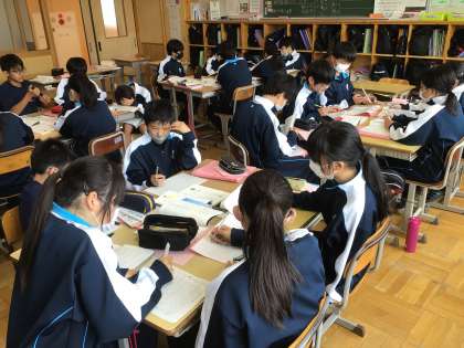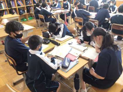 1年生の国語科の授業の様子です。段落ごとに要点をまとめていました。グループの仲間と話し合いをしながら進めていました。