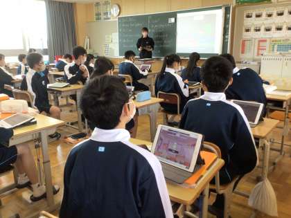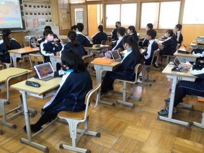 1年生の英語科の授業の様子です。学習用タブレットを活用して、クイズ形式で問題に取り組んでいました。