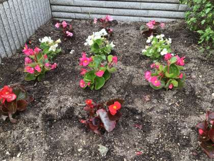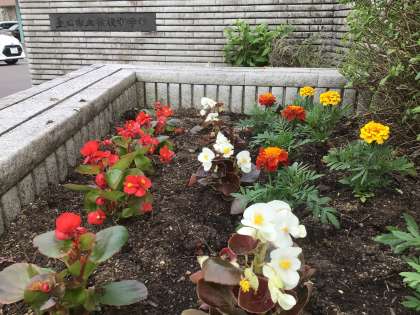 正門横の花壇の様子です。公務手さんが花の植え替えをしました。これから梅雨の時期を迎えます。花を見ると、心が落ち着きますね。