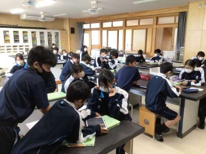 1年生の理科の授業の様子です。動物の分類について学習していました。分からないことがあると、学習用タブレットを活用して調べていました。