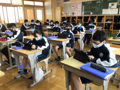 1年生の社会科の授業の様子です。学習用タブレットを活用して、クイズ形式で復習問題に取り組んでいました。ICT機器を授業で効果的に活用できるように、教員も研修を進めています。