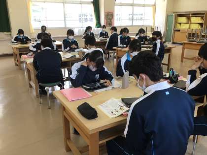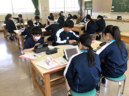 3年生の家庭科の授業の様子です。幼児のからだと心の発達について学習していました。学習用タブレットを活用して、幼児のからだの動きを調べていました。