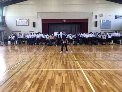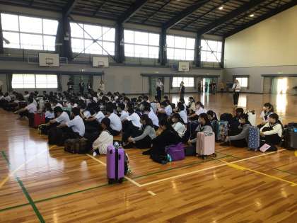 修学旅行の出発式の様子です。今日から2泊3日の旅行となります。校長先生から、「みんな笑顔で学校へ帰ってきましょう」、生徒代表から「時間やルールを守りましょう」と話されました。