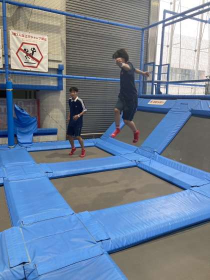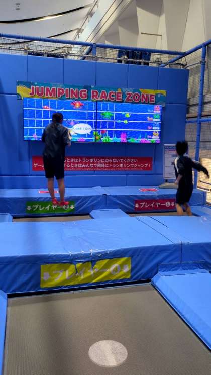 3組はトンデミ平和島にやってきました。トランポリンで宙を舞っています。