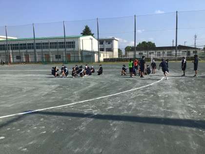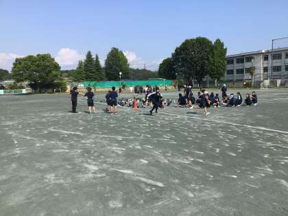 1年生の学年レクリエーションの様子です。秋に行われる「猿楽祭」の種目にもなっている「綱引き」や「リレー」をしていました。