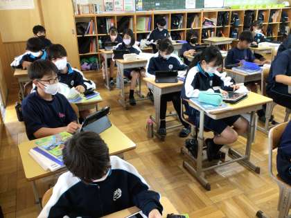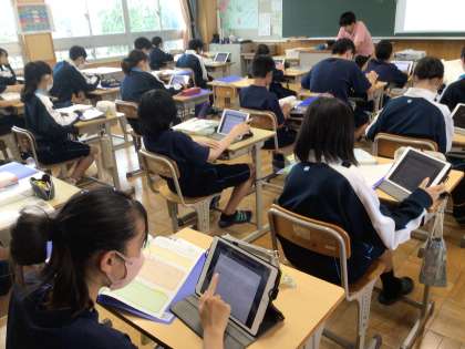 1年生の社会科の授業の様子です。学習用タブレットを活用して、互いに復習問題を作成して、解きあっていました。