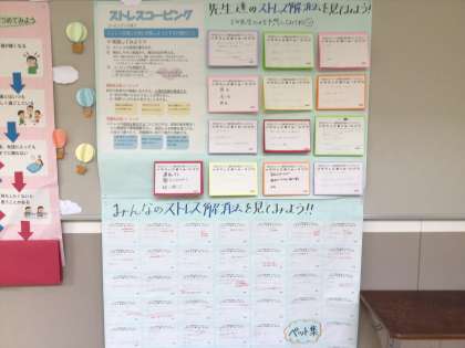 保健室より 公開日 2024/07/17 更新日 2024/07/17 各学年から 保健室の廊下側の掲示板です。「ストレスコーピング」について掲示されています。いろんな人のストレス解消法も紹介されています。