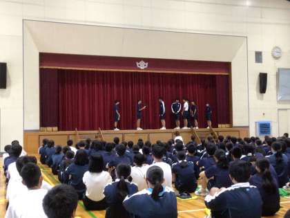 全校集会のあと、生徒会主催のあいさつコンクールの表彰をしました。