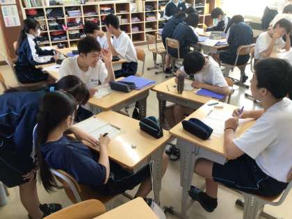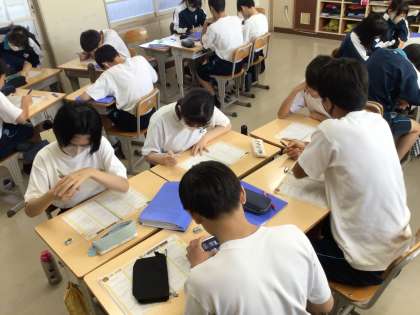 3年生の数学科の授業の様子です。平方根について学習していました。さまざまな問題に取り組んでいました。互いに教え合いながら進めていました。