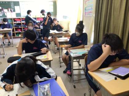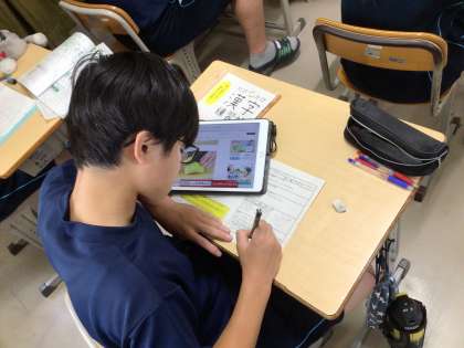 2年生の家庭科の授業の様子です。献立づくりに取り組んでいます。本校の栄養教諭も授業に参加していました。