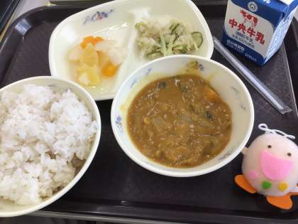 今日の給食の献立は「たべまるのおすすめ献立」です。夏野菜を使ったカレーです。なす、ピーマン、かぼちゃなどが使われています。