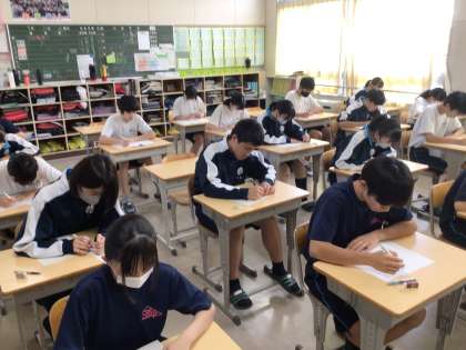 3日間にわたって実施された定期テストも終わりました。来週には、それぞれぞれのテストが返却されます。今回のテストに向けての取り組みを振り返り、次回へ生かすことができるといいですね。写真は、3年生の様子です。