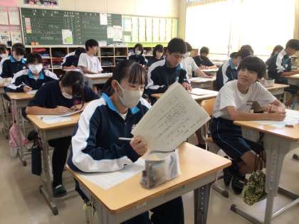 先週実施された定期テストの答案用紙が返却されています。今回のテストに向けての取り組みについて振り返っていました。3年生の様子です。